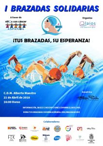 I Brazadas Solidarias es una competición de natación por equipos, que organiza la A.D. Elaios LGTB+ a favor de ASPANOA la asociación de Padres de Niños con Cáncer de Aragón www.aspanoa.org, en la que cada equipo deberá completar una distancia de 5.000 metros en relevos de 100 metros.